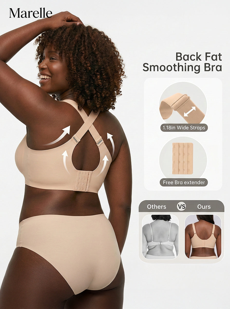 This was one of the most common complaints we heard when building Marelle. The band is wider than a standard bra band and sits flat against the body because it has no rigid elastic piping that forces it to fold. It is designed to move with your stomach when you sit or bend rather than fight against it. It will not eliminate an apron belly but it will not roll up over it either.