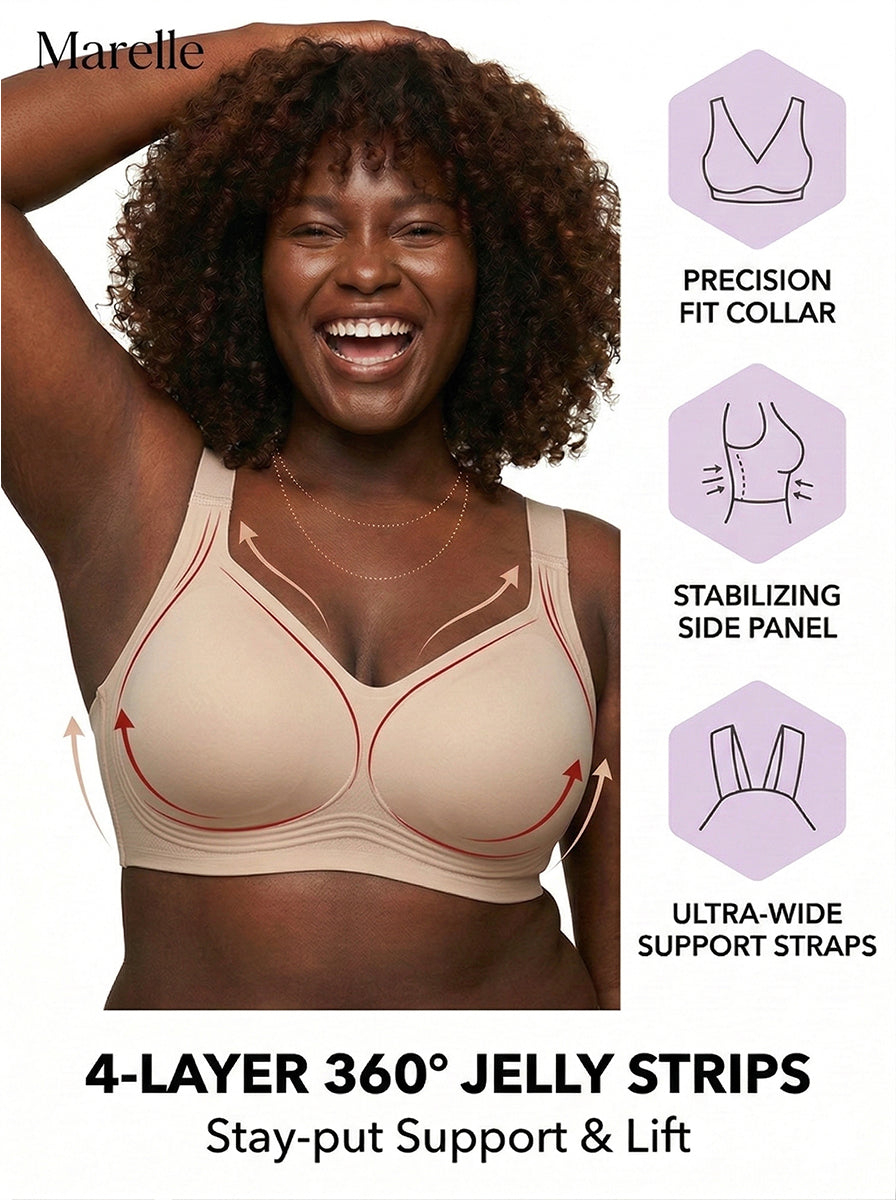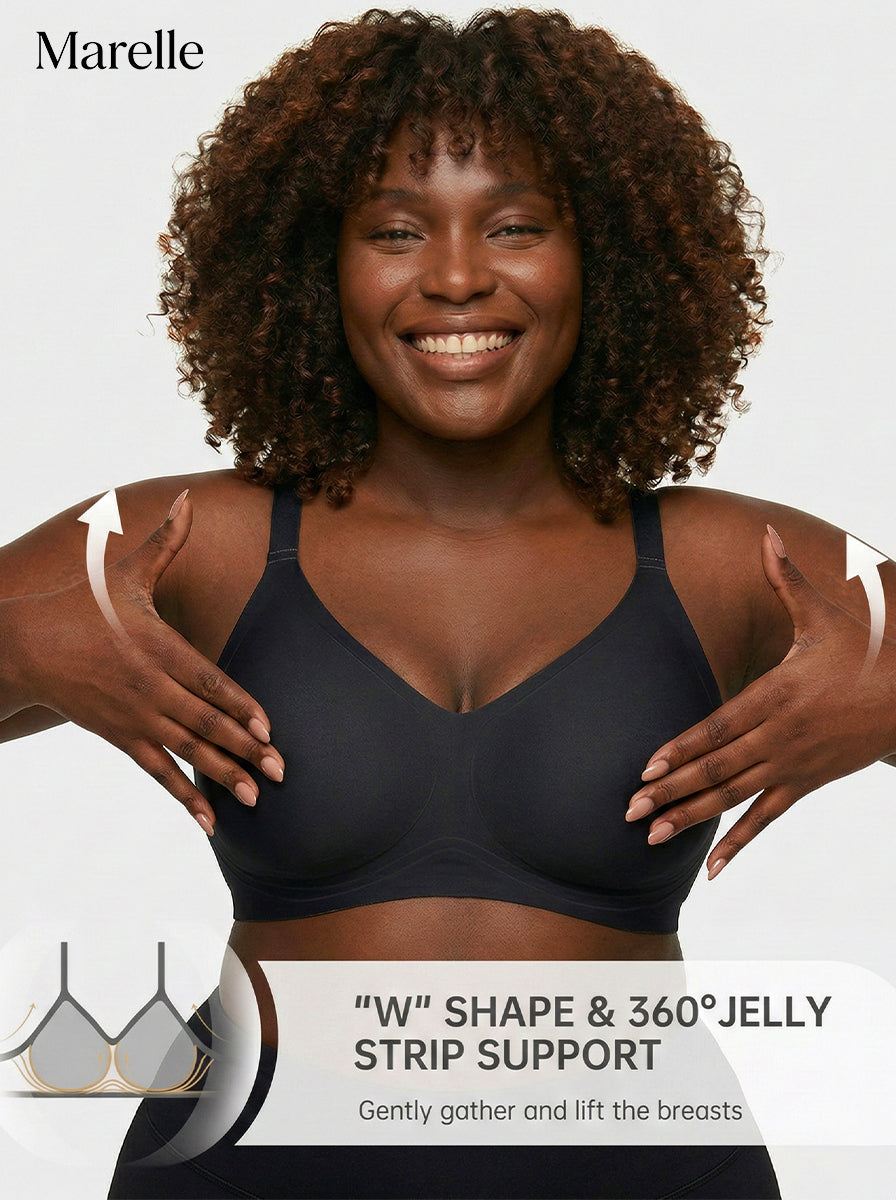 Most jelly bras use a thin gel strip as a decorative detail — not a real structural support system. Marelle's W-shaped strip is load-bearing. It was engineered specifically to carry the weight of a fuller bust from below, the same way an underwire does mechanically, but without the rigidity. The difference is in the shape of the strip and the depth it sits at along your underbust. Most customers who felt let down by other jelly bras feel the difference within the first hour of wearing Marelle.